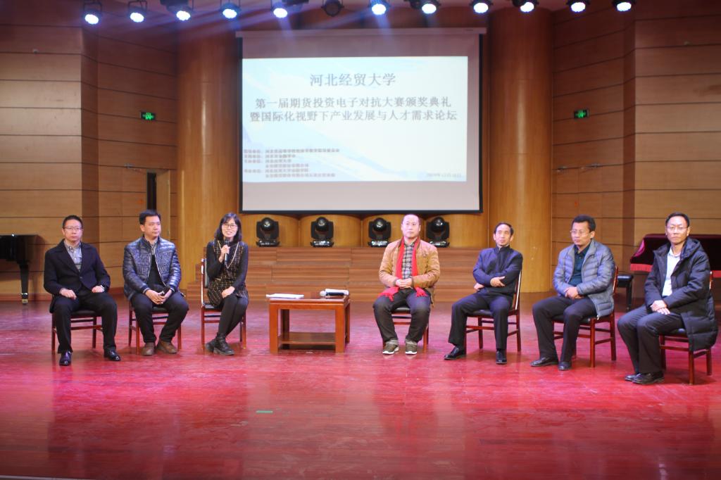 在圆桌论坛环节,香港交易所市场发展科内地客户发展部副总裁郭菲,鸡蛋期货交割库同集团公司敦朴贸易公司副总经理郝建然,玉米、白糖、小麦期货交割库冀粮集团副总裁赵长尧,世祖资产私募副总经理刘光普,永安期货股份有限公司石家庄营业部总经理王吉元,河北师范大学商公司教授于汝学、石家庄铁道大学经济管理公司副经理张艳辉、太阳成tyc122cc集团副经理杨雪美,共八位产学界专家学者分别围绕“期货+保险/订单”和“期货+保险/期权”如何服务区域产业、金融国际化视野下企业如何运用期货服务自身发展战略、如何获取正常利润和交易利润等相关的做法以及金融国际化对人才的要求等议题进行分享交流,并与同学们进行互动,现场气氛活跃,同学们纷纷举手发言,与业内专家探讨期货交易过程及人才需求等相关问题。