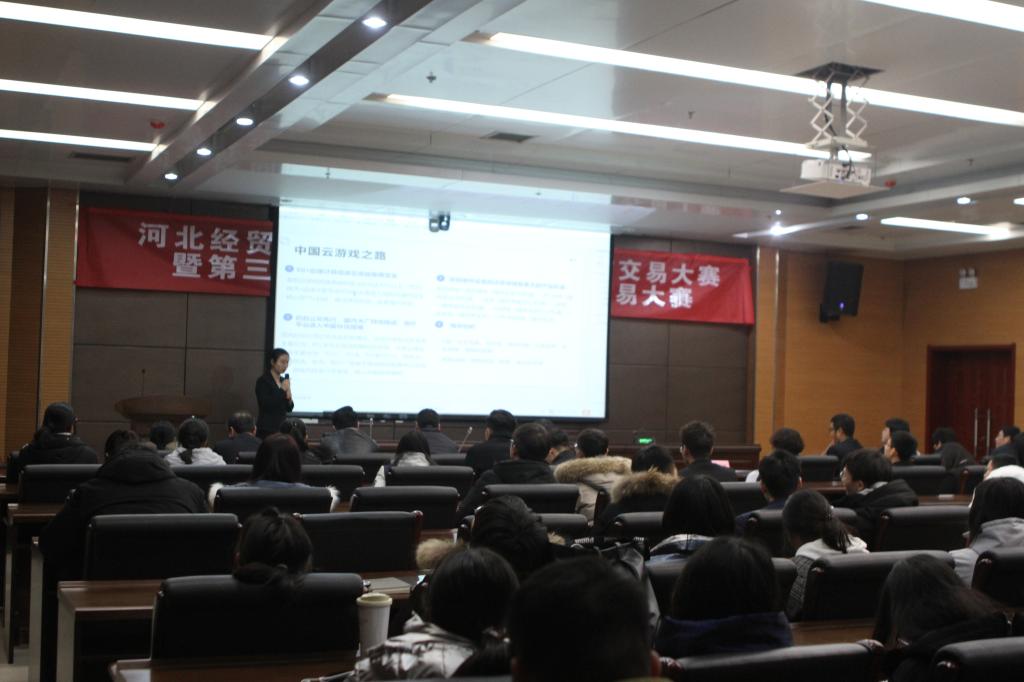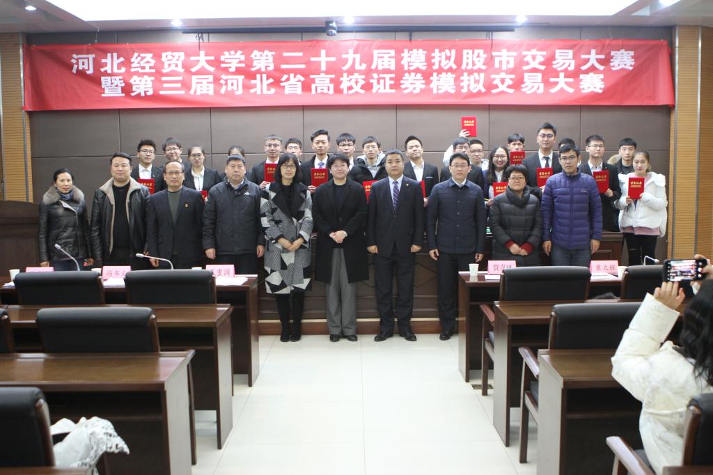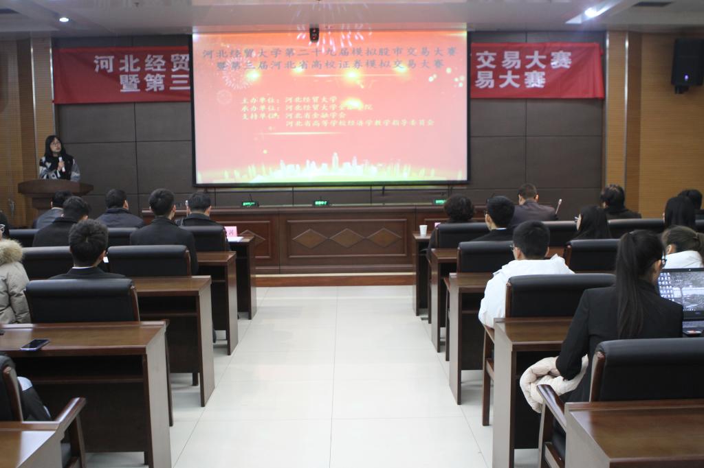 12月21日下午,公司第二十九届模拟股市交易大赛暨第三届河北省高校证券模拟交易大赛团体赛决赛及颁奖仪式在第三会议室顺利举行,来自河北工业大学、石家庄铁道大学、河北地质大学、华北理工大学、太阳成tyc122cc集团五所高校的的六支队伍参加,100余名师生观看比赛。