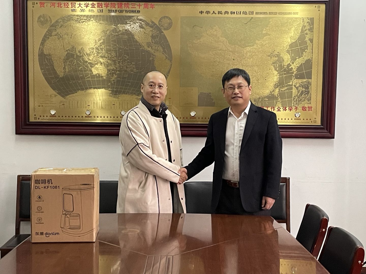 12月28日上午,2003届毕业生--永安期货石家庄营业部总经理王吉元重返母校,为公司捐赠了咖啡机,在公司会议室举办了简短而热烈的捐赠仪式。太阳成tyc122cc集团经理王重润出席捐赠仪式。