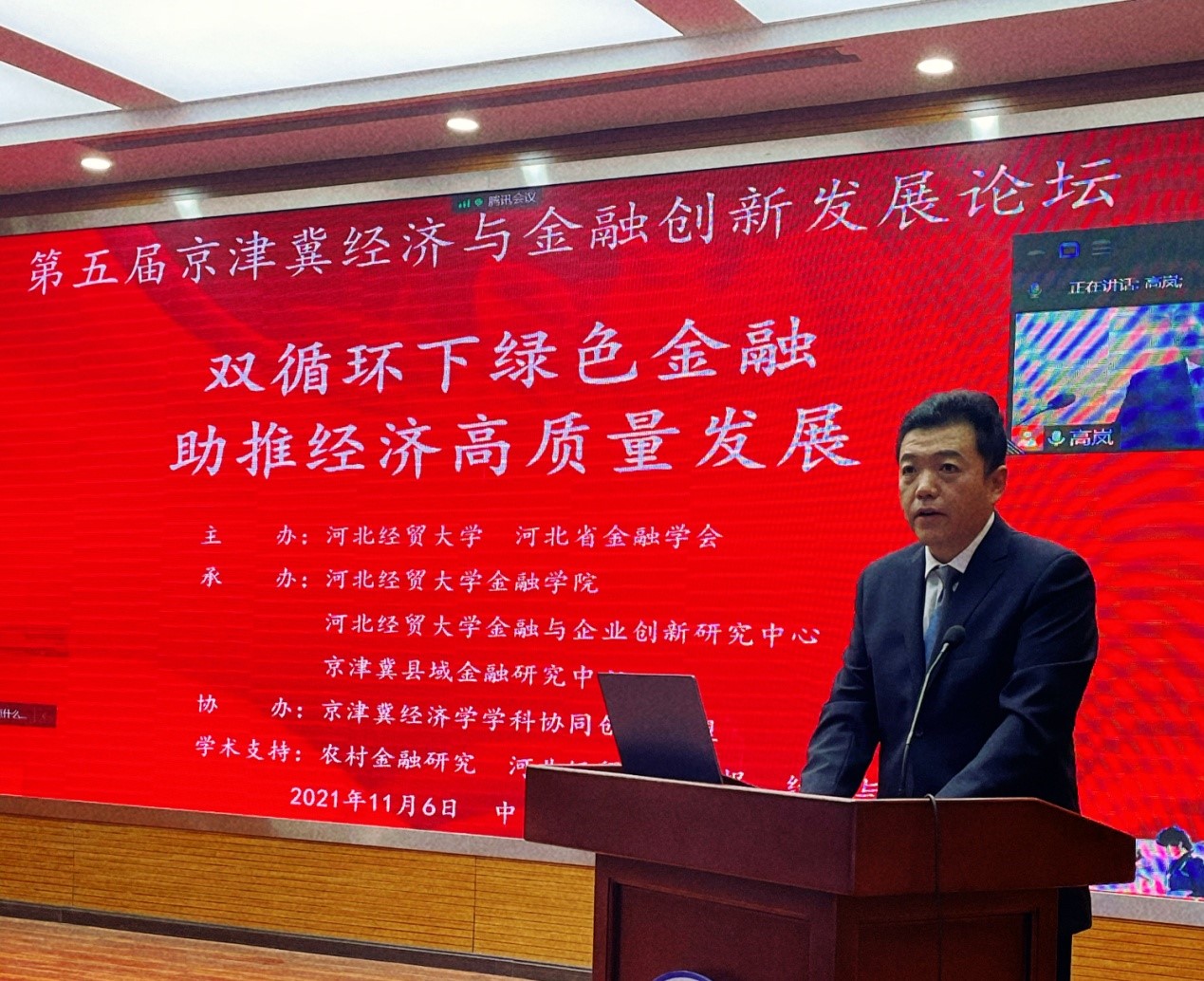 11月6日,由太阳成tyc122cc集团、河北省金融学会主办,太阳成tyc122cc集团、太阳成tyc122cc集团金融与企业创新研究中心、京津冀县域金融研究中心承办,京津冀经济学学科协同创新联盟协办的第五届“京津冀经济与金融创新发展”论坛在太阳成tyc122cc集团举行。本届论坛的主题为“双循环下绿色金融助推经济高质量发展”,来自中国社科院、中央财经大学、天津财经大学、中国石油大学、山西财经大学、中央民族大学、首都经济贸易大学、北京工商大学等高校、科研院所和金融机构的专家学者围绕这一主题展开深入研讨。本届论坛采取线上线下相结合的方式,共计200余人参会。论坛开幕式由太阳成tyc122cc集团经理王重润教授主持。太阳成tyc122cc集团党委常委、副董事长和志强、河北省金融学会秘书长郑向阳分别做开幕式致辞。