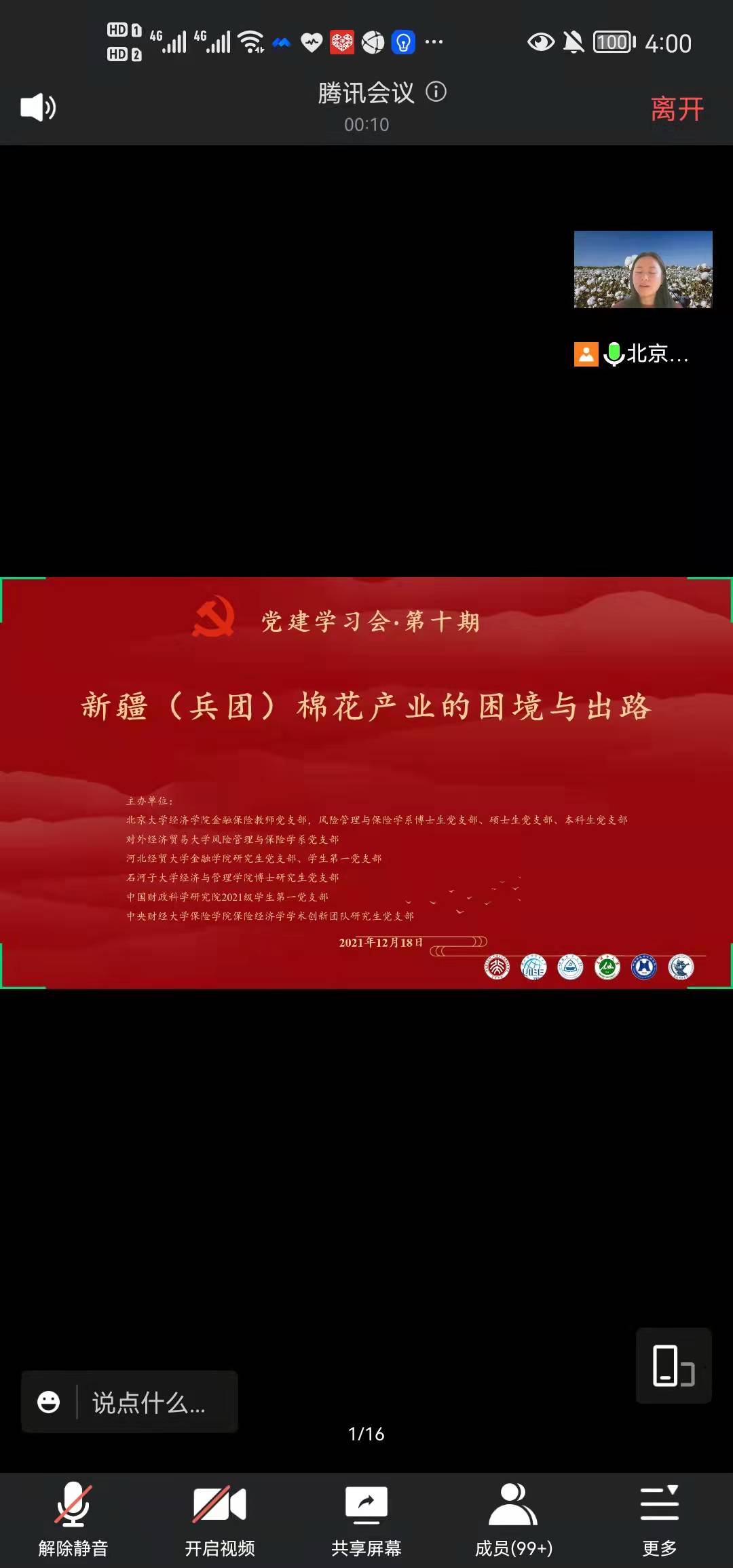 12月18日下午,公司研究生党支部、员工第一党支部和北京大学经济公司金融保险教师党支部、风险管理与保险学系博士生党支部、硕士生党支部、本科生党支部,对外经济贸易大学风险管理与保险学系党支部,石河子大学经济与管理公司博士研究生党支部、中国财政科公司2021级博士研究生党支部,中央财经大学保险公司保险经济学学术创新团队党支部共同开展了支部共建活动,活动主题为“新疆(兵团)棉花产业的困境与出路”。本次学习活动采取线上腾讯会议的形式进行,六所高公司党员代表100余人参加。