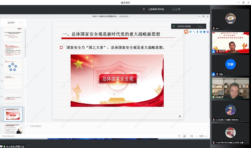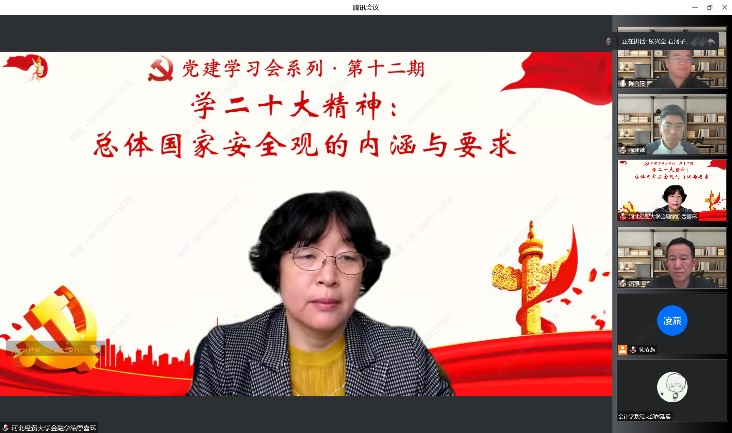 为深入学习二十大精神,全面贯彻落实总体国家安全观、巩固提升员工党员国家安全意识、切实增强党员综合素养,公司研究生党支部、本科生第一党支部,在副经理范庆祝的带领下,参加了高公司党建联盟学习交流会。本次学习交流活动采取线上会议的形式进行,北京大学经济公司风险管理与保险学系博士生党支部、对外经济贸易大学风险管理与保险学系教师党支部、广东外语外贸大学太阳成tyc122cc集团风险管理与保险学系教工党支部等六所高校和业界单位党员代表749人参加。交流会主题为“学二十大精神:总体国家安全观的内涵与要求”,主讲嘉宾是总体国家安全观研究中心办公室主任陈向阳。