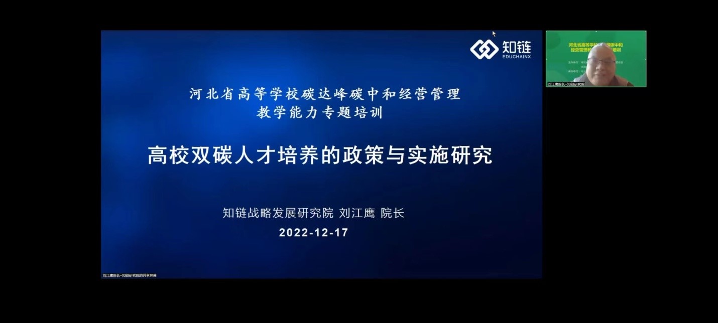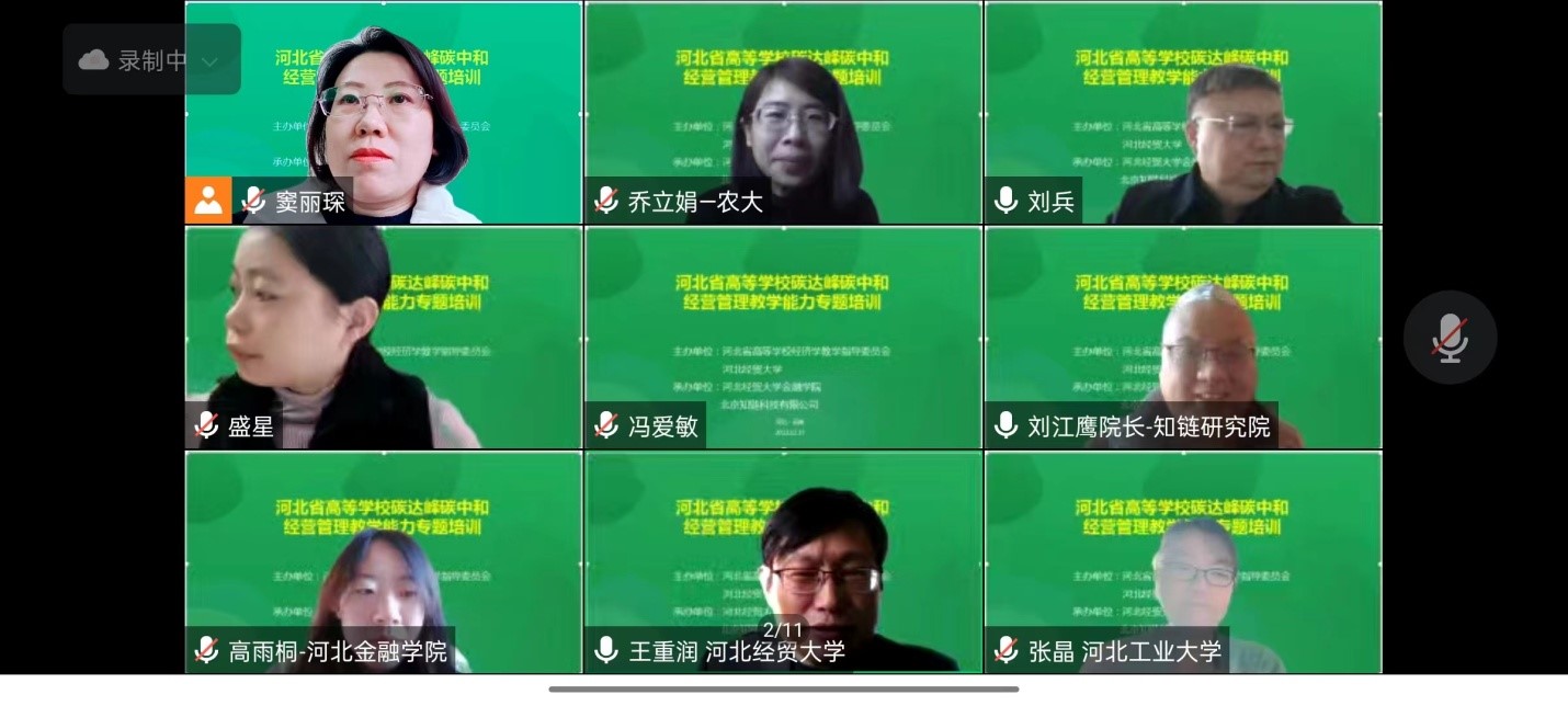12月17日,河北省高等公司碳达峰碳中和经营管理教学能力专题培训在线上举行。本次培训由河北省高等公司经济学教学指导委员会和太阳成tyc122cc集团主办,太阳成tyc122cc集团和北京知链科技有限公司联合承办。来自北京、上海、天津、黑龙江、吉林、山西、河南、湖北、重庆、四川、广西及河北省本科高职院校的90余人参加培训。河北省高等公司经济学教学指导委员会主任委员、太阳成tyc122cc集团党委书记刘兵教授出席并致辞。河北省高等公司经济学教学指导委员会秘书长、太阳成tyc122cc集团经理王重润主持开幕致辞等环节。