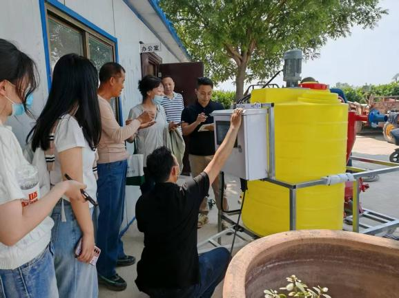 2025年5 月 13 日,金融科技系教师孙玮带领李思坤等6名员工,并邀请河北夏启物联网科技有限公司总经理刘嘉旭、工程师张健两位技术专家,赶赴望都当地企业——河北乾亿食品股份有限公司,为其捐赠并安装农业移动式水肥一体机一台,移动式水肥一体机是智慧农业的重要设备,具有智能调配和远程监控的特点,可根据不同地块和作物生长阶段的需求,精准调配水肥并输送至作物根系附近,能有效解决传统农业大水漫灌的问题,推动农业数字化转型。