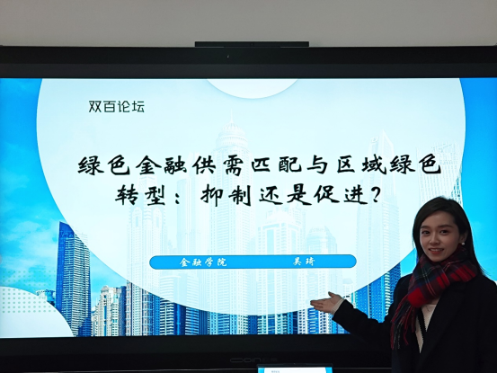 随后,吴琦老师介绍了文章的研究内容。文章建立在绿色金融供需匹配机制的基础上,分别测度了中国286个地级市、30个省份的绿色金融供给与需求发展水平,并进一步测度中国各地区的绿色金融供需匹配情况与异质性。通过计量分析得出绿色金融供需匹配对企业绿色转型具有显著影响。