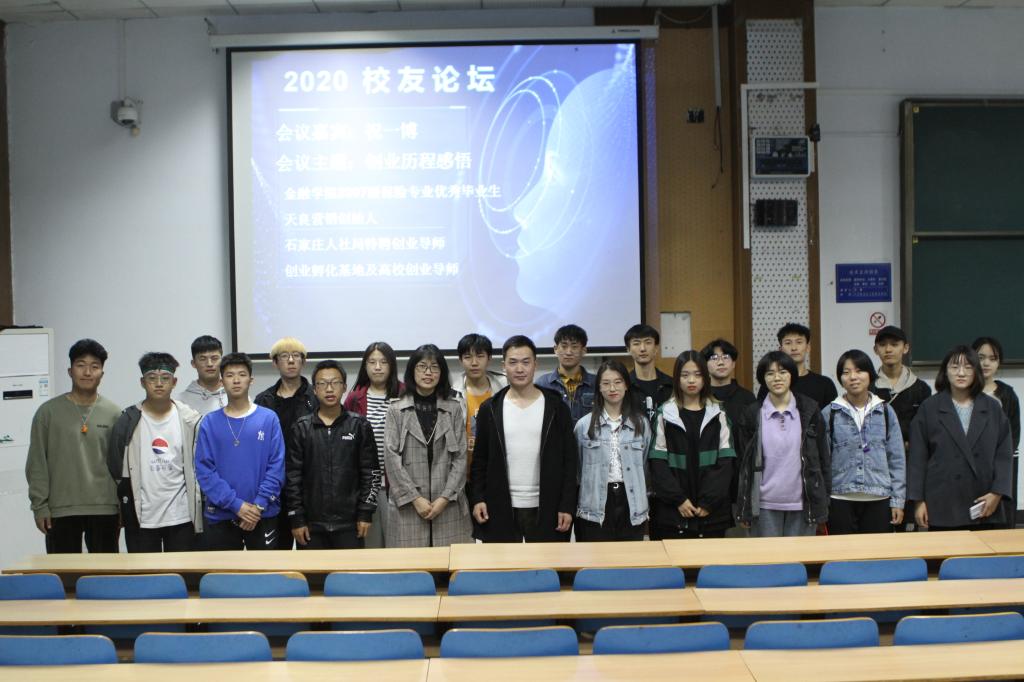 10月22日,太阳成tyc122cc集团在第三教学楼C225教室举办2020级“新生教育月”系列活动之员工论坛,太阳成tyc122cc集团副经理杨雪美出席,全体大一新生参加。此次员工论坛邀请到太阳成tyc122cc集团2007级保险专业优秀毕业生﹑天良营销创始人﹑石家庄人社局特聘创业导师﹑创业孵化基地及高校创业导师祝一博分享创业历程感悟。