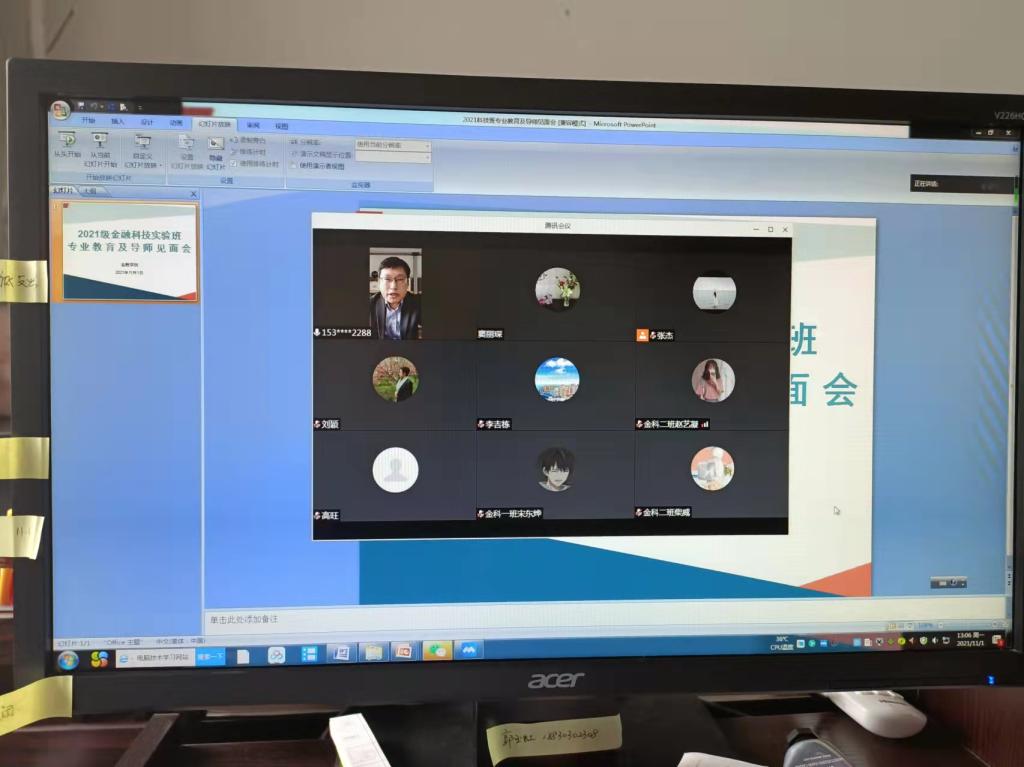 11月1日太阳成tyc122cc集团通过腾讯会议平台线上举办金融科技实验班专业教育及导师见面会。金融公司党委书记贾喜环、经理王重润、副经理窦丽琛、副经理范庆祝出席,2021级金融科技实验班导师及全体员工参加,会议由窦丽琛主持。